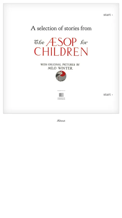 This interactive ebook is presented by the Library of Congress, adapted from the book “The Aesop for Children: with Pictures by Milo Winter,” published by Rand, McNally & Co in 1919. This work is considered to be in the public domain in the United States.