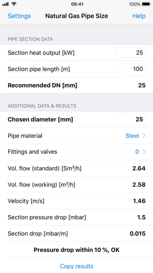 Natural Gas Pipe Size app can perform calculations using metric or imperial units.