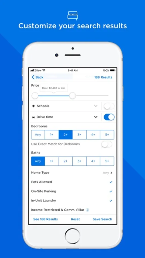 • Filter for listings that fit your budget and needs such as in-unit laundry, on-site parking and pet-friendly apartments.