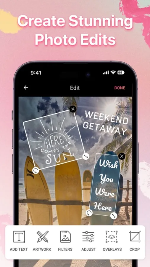 Create amazing edits with over 200+ additional fonts, stickers, filters & overlays