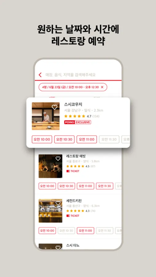 POING을 활용하면 매장에서 전화를 받을 때까지 핸드폰을 붙잡고 있지 않아도 됩니다. 고객이 원하는 인원, 날짜, 시간만 설정하면 원하는 레스토랑의 예약 가능한 날짜와 시간을 바로 확인할 수 있어 전화 예약보다 쉽고 빠른 예약 및 결제가 가능합니다.