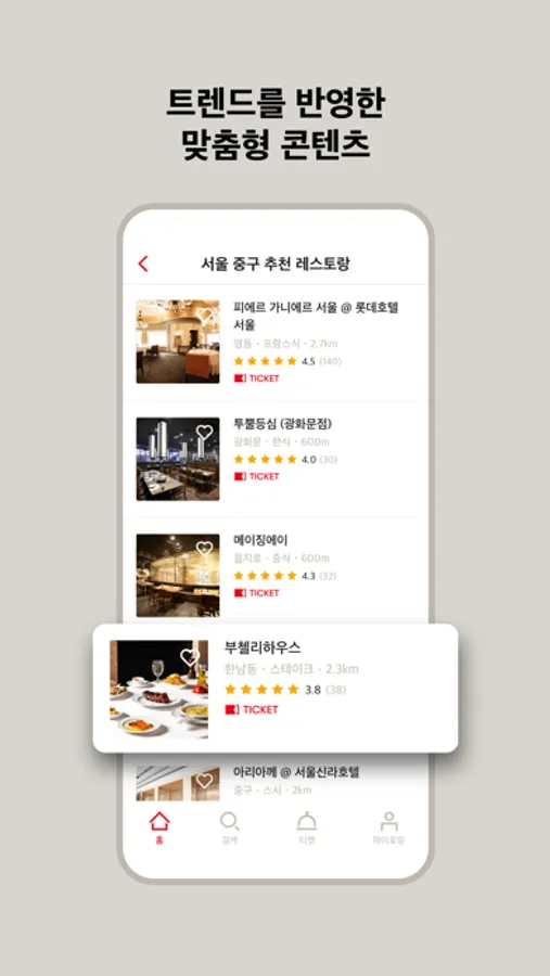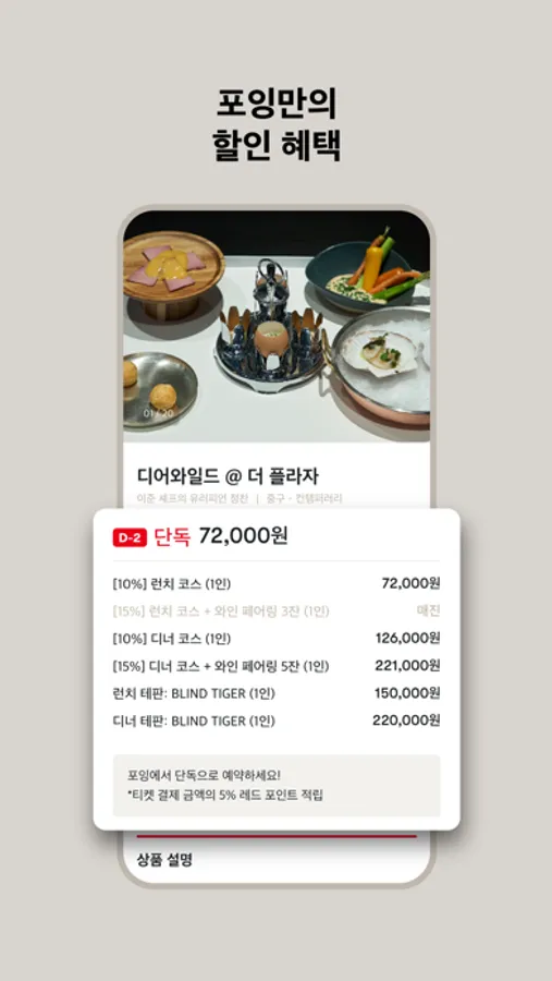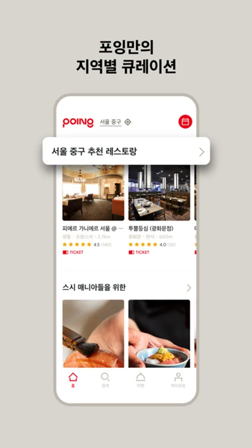 평소 예약이 어려운 레스토랑을 선별하여 지역별 맞춤 콘텐츠를 제공함과 동시에 포잉 고객에게만 제공되는 다양한 혜택을 통해 즐거운 미식 경험을 제공합니다.