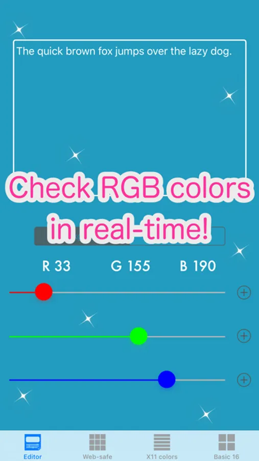 In editor tab, text/background color can be changed using RGB sliders. Also you can edit the text.