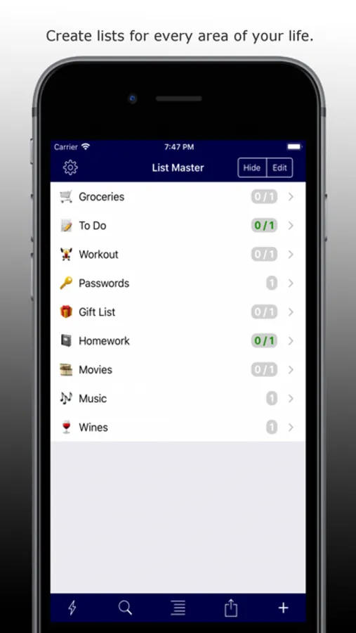 Getting organized is now easy and fun. With List Master, you can make the perfect Grocery List, Password List, To Do List, Gift List, any kind of list you want. This is your perfect personal database. With List Master, you get to decide exactly what type of information you want to store in your lists. Then List Master's revolutionary design lets you view your lists any way you want. List Master gives you the tools you need and then gets out of the way.