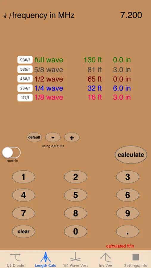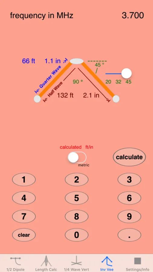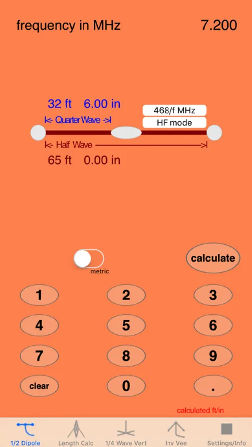 ▪ The easy to use and intuitive interface makes it easy to calculate starting lengths for building your antennas. It will calculate the starting length for "Dipoles", "Verticals" and "Inverted Vee" antennas. There is also a page for calculating 1/8, 1/4, 1/2, 5/8 and "Full Wave" length.