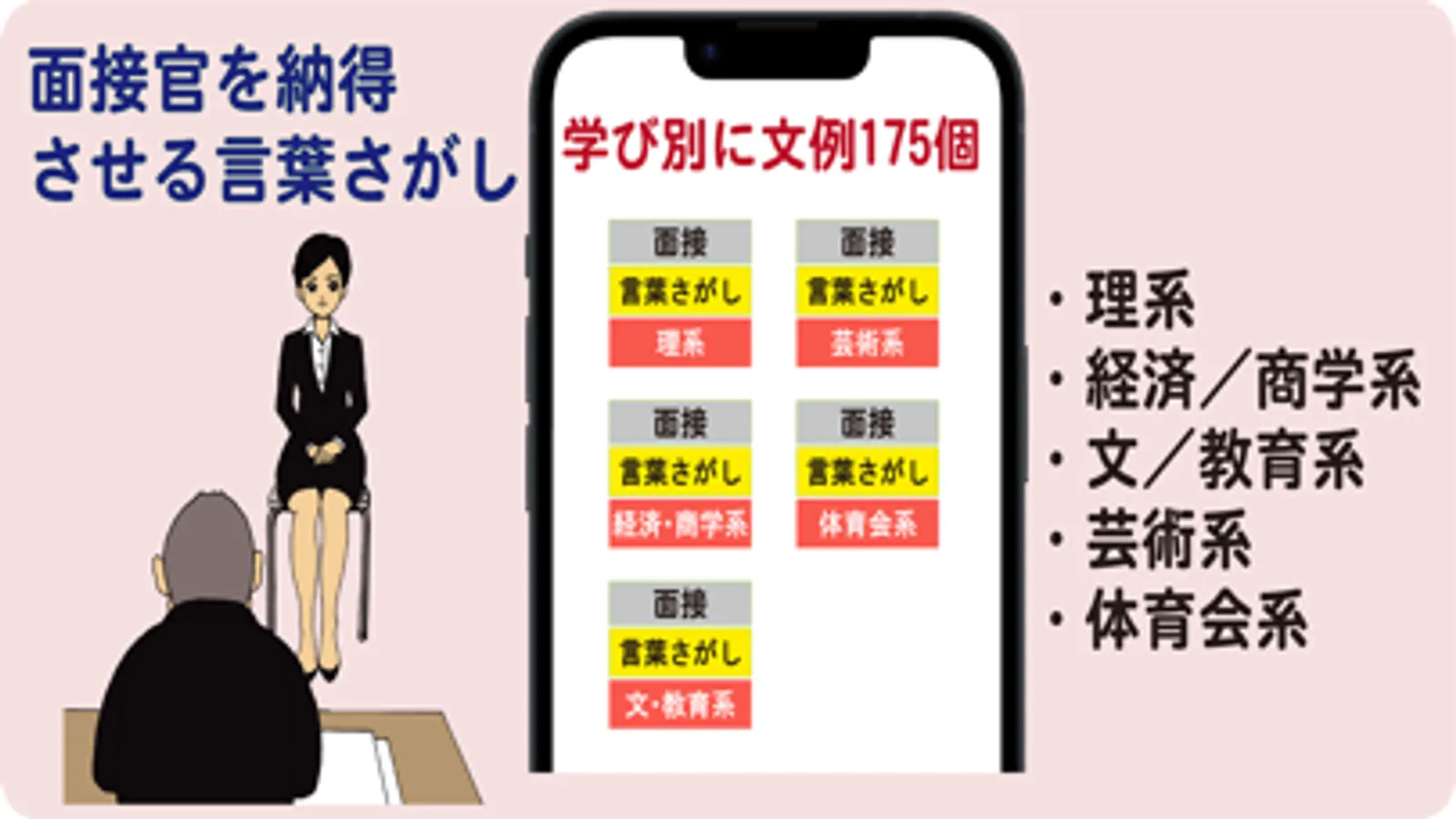 理系、経済・商、文・教育、芸術、体育会など、学びによって異なる質問と回答にも対応しています。
