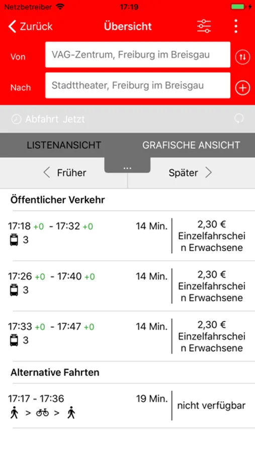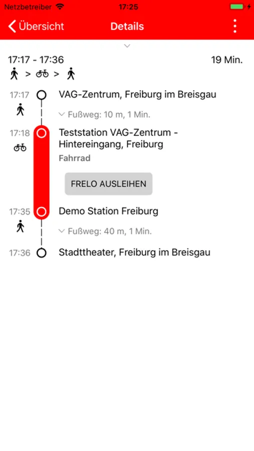Für viele Züge, Busse und Stadtbahnen sowie für unser Fahrradverleihsystem Frelo liegen Echtzeitinformationen vor. So können Sie unterwegs prüfen, ob Ihre Fahrt pünktlich beginnt, aktuell ein Leihrad der gewünschten Station vorhanden ist oder Sie können sich spontan für eine alternative Verbindung entscheiden. Bei Verbindungen mit der Freiburger Verkehrs AG wird angezeigt, ob es sich um ein Fahrzeug mit barrierefreiem Zugang handelt.