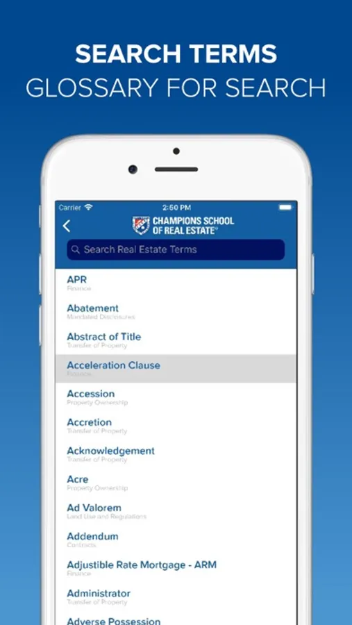 This app can supplement the Exam Prep Course, or be used as a stand-alone resource for any future sales agent. Study anywhere, anytime and master over 500 terms and definitions commonly used on the exam. Flash card decks are organized by topic. Cards can be marked for later review and terms can be searched in the glossary feature.