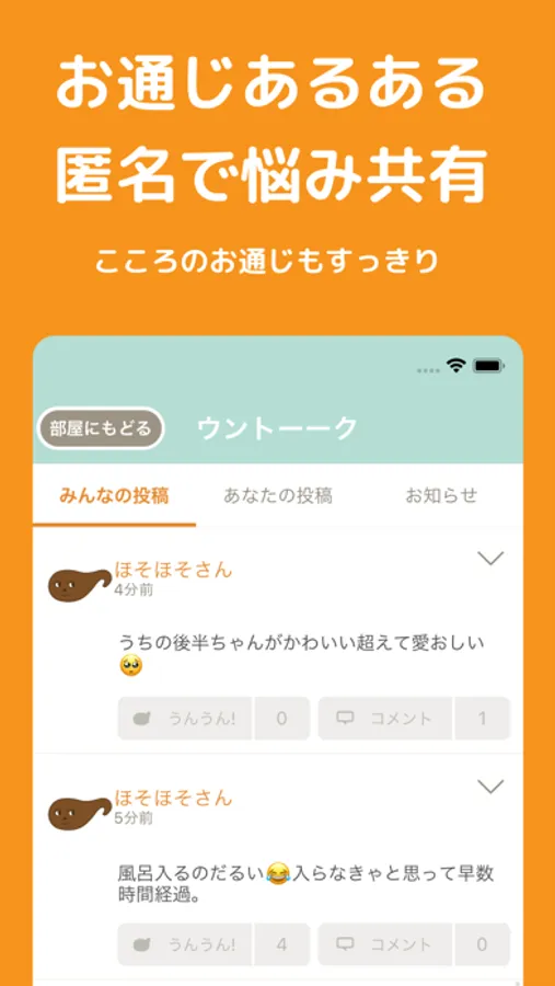 リアルでは話しづらい便秘や下痢などのお通じの悩みや、腸活・美容・ダイエットの情報共有までなんでも話せるうんちSNS機能。心の便秘もスッキリ流しちゃいましょう!