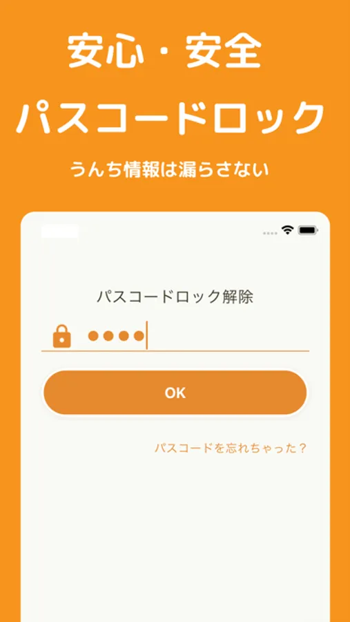 排泄や体重などのセンシティブな健康情報は誰にも見られたくない!ウンログは安心安全のパスコードロック機能で、大切な情報を誰にも漏らしません。