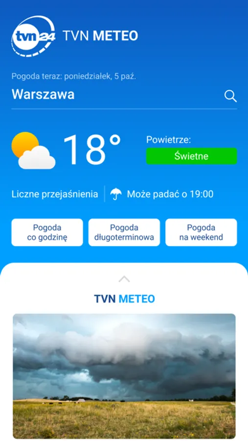 Aplikacja TVN Meteo w nowej odsłonie to szybki i wygodny dostęp do aktualnych prognoz pogody dla tysięcy lokalizacji w Polsce i na świecie. Dzięki aplikacji można także przeglądać wszystkie informacje z serwisu tvnmeteo.pl, oglądać wideo i zdjęcia.