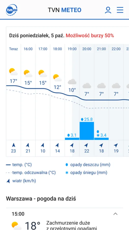 - prognoza temperatury i opadów godzina po godzinie, w formie prostych i wygodnych wykresów;