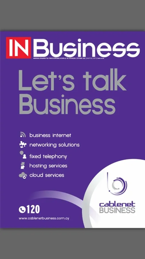 IN Business magazine has a monthly readership of more than 50,000. It is the only monthly business magazine in the Cyprus market that provides an overall approach to all segments of the economy, ranging from retail to services, as well as reporting on new deals, presenting new faces and, generally, all that is going on in the domestic business realm. IN Business has been a pioneer in local business journalism, thanks to its in-depth analysis and its research backed by never-before published facts and figures.