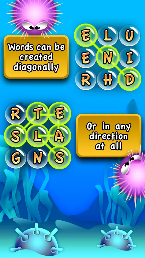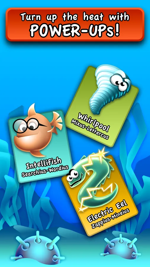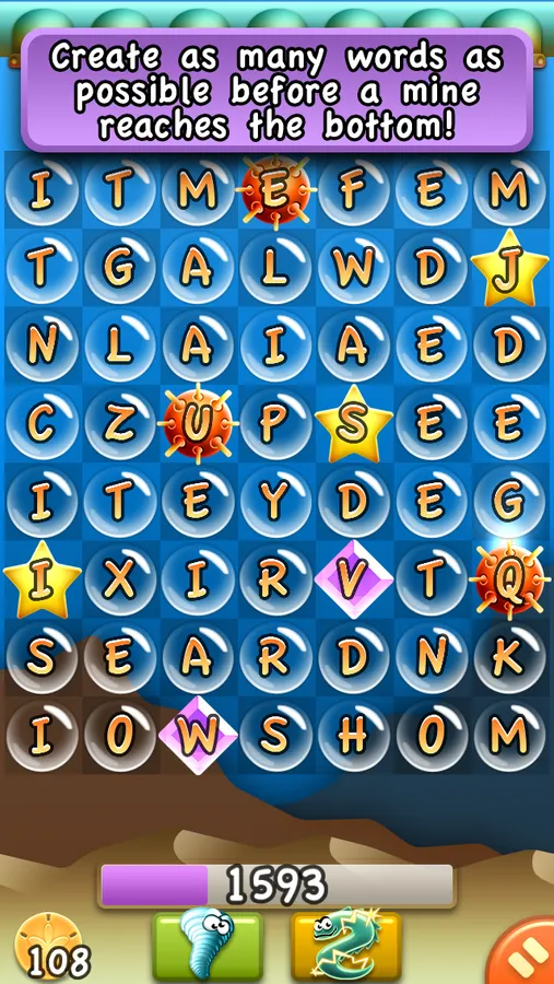 String together letters to create words and detonate the evil sea mines! Build bigger words to earn bonuses like double, triple, or even quadruple word scores... Combine multiple bonuses for crazy huge points! Don’t forget to watch out for those nasty mines — if they reach the ocean floor it’s game over!