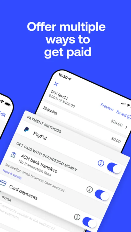 Invoice and accept payments with ease using Invoice2go. Set up Invoice2go Money to easily keep track of your payments and expenses in one central place. Small business owners in over 160 countries trust Invoice2go to send professional invoices and estimates to clients.