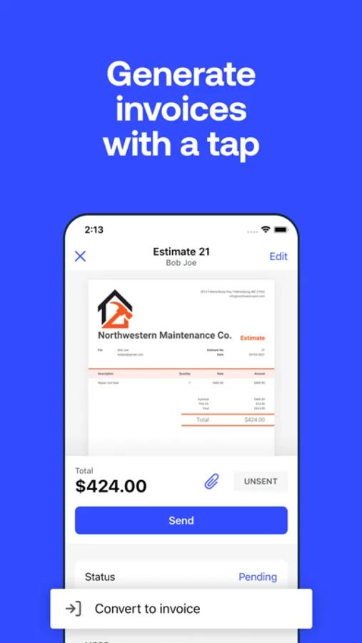 - Convert an estimate into an invoice in seconds.
