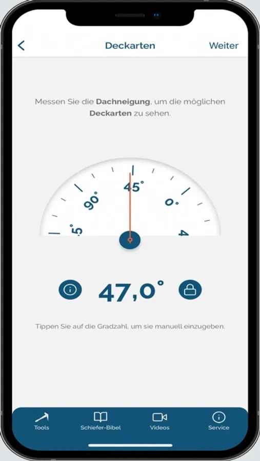 Durch Messung oder manuelle Eingabe der Dachneigung wird Ihnen die entsprechende Gebindesteigung angezeigt.