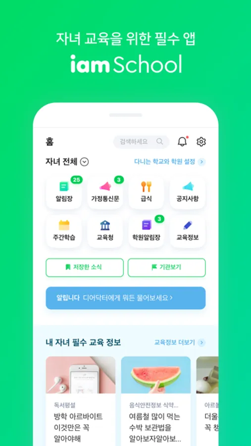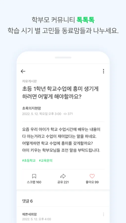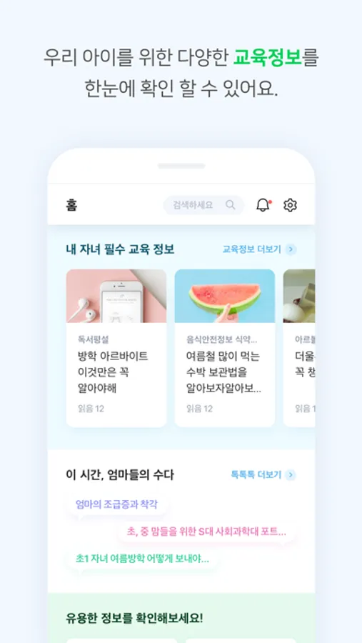 학교/학원에서 보내는 알림장 뿐 아니라, 학부모 최대 커뮤니티와 최신 교육 정보를 확인하세요.