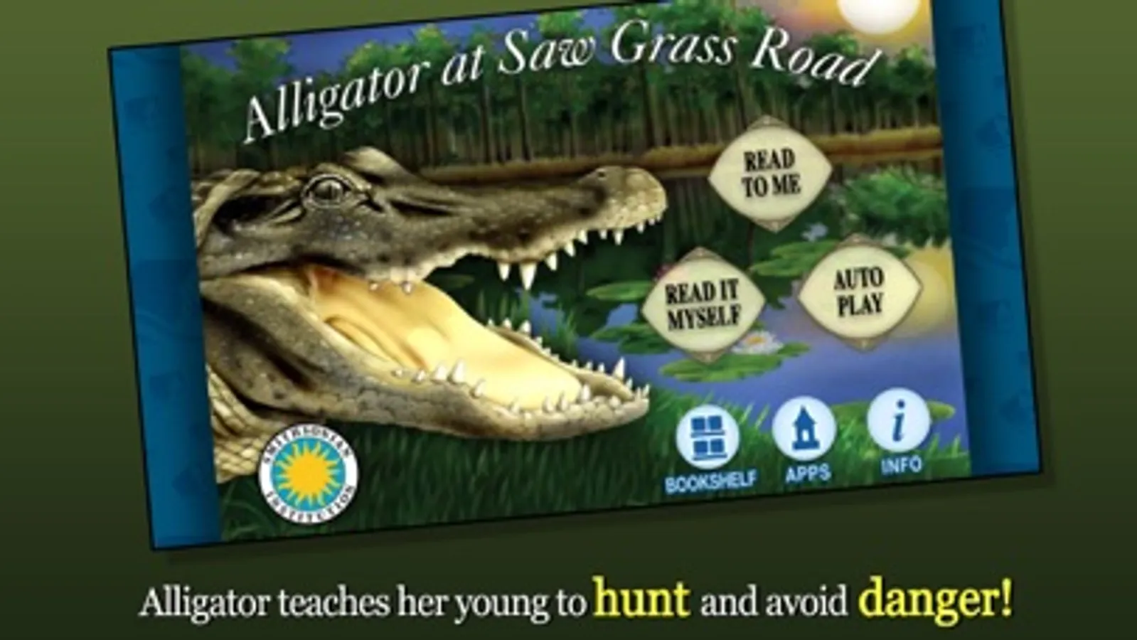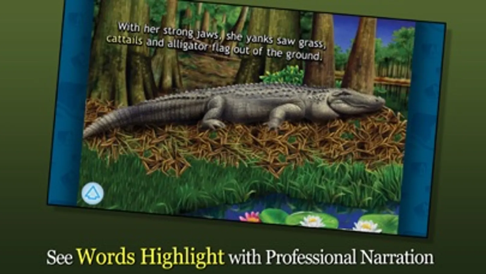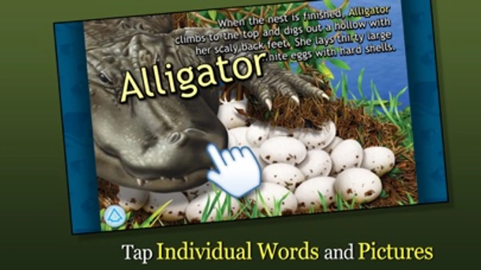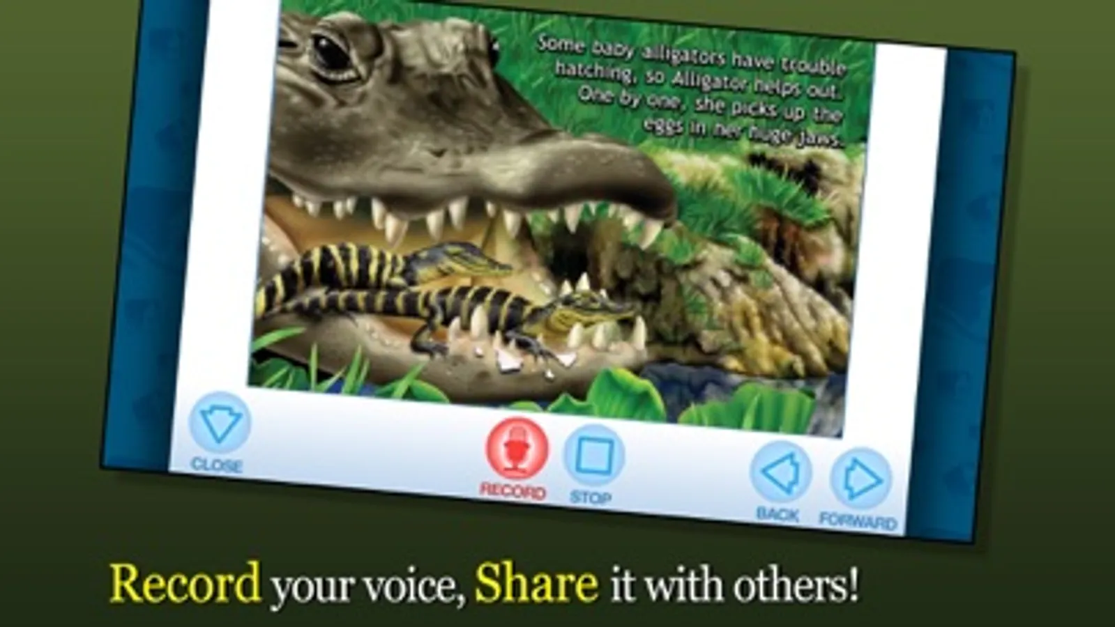 Join Alligator in this exciting digital book app as she raises her young once they hatch from their eggs. Explore pictures, learn new vocabulary, and personalize the story with your own narration. Kids will love learning as they watch the baby alligators learning to hunt, swim, and evade danger throughout the story.