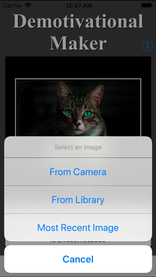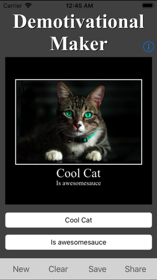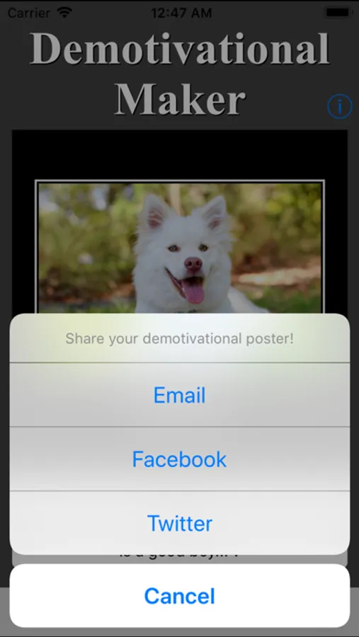 Want to create your own demotivational posters using your own pictures? Create them with ease from this app! It's so simple to use you can create a demotivational picture in just a few steps. Use pictures from your library or camera, add the text, then save it or share it out to the world via e-mail, Twitter or Facebook.