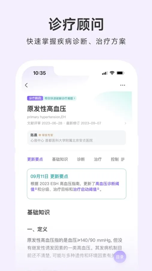 2. 诊疗顾问:4000+ 条临床常见疾病的诊疗决策支持,覆盖 90% 临床常见疾病。内容涵盖基础知识、诊断依据、治疗原则、控制目标等核心诊疗环节,并提供疾病的「经典用药」信息查询,内容更实用,决策更安全。