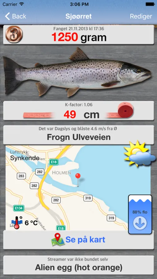 Med denne appen er det lett å registrere fangst rapporter på iPhone og iPad. Dette er en app hvor du kan registere din fangst med bilde, vekt, sted og værdata. Du kan få god oversikt over hvilke fluer du har brukt, værtype, tidevann etc. Alle fangster vil vises på samme kart. Data kan lastes opp til internett. Dine fangster vil bli sortert etter egne valg, og største fisker vil bli fremhevet. Du kan etterhvert få opp en fin statistikk over hvilke værforhold etc. du har hatt best fiske ved.