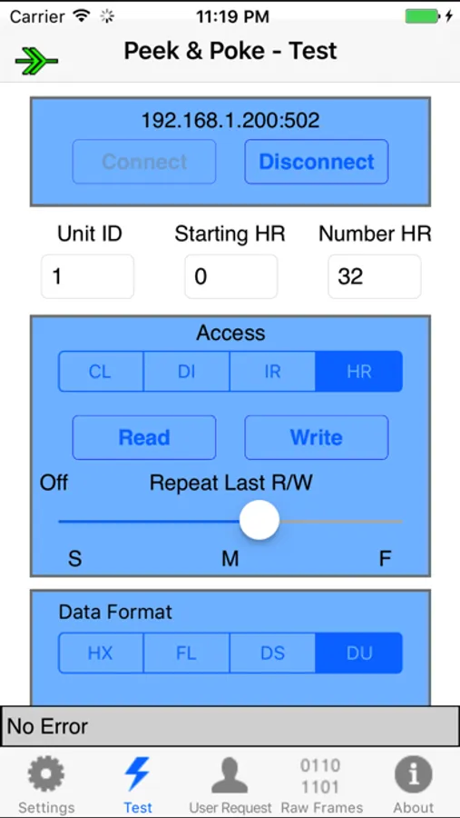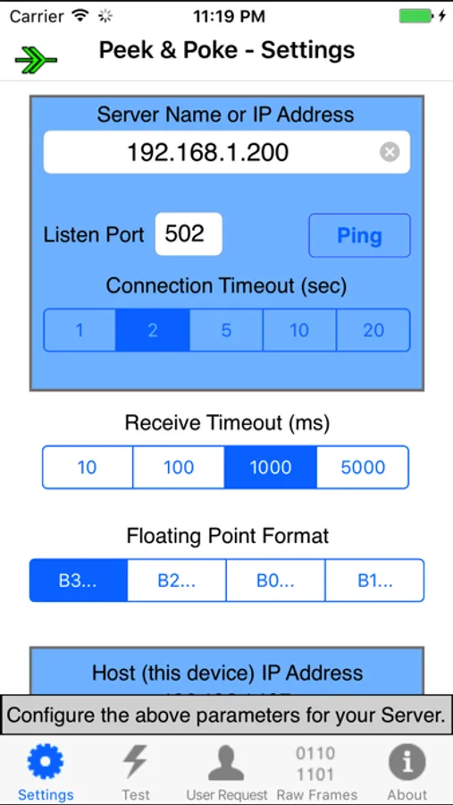 Modbus Peek & Poke allows you to access the registers, coils and discretes of your Modbus device from your iPhone or iPad.
