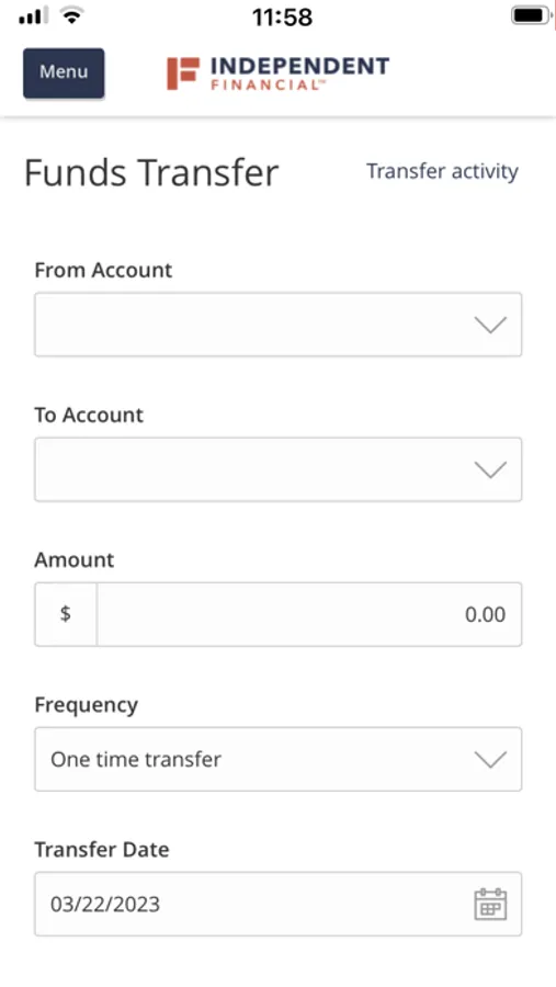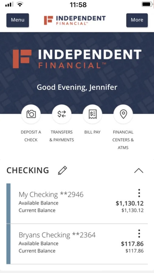 The Independent Financial mobile app provides access to real-time account balances, mobile deposit, mobile bill pay, fund transfers, account tracking, and branch or ATM locating.