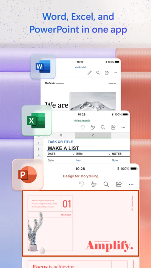 • Your go-to mobile app for productivity with Word, Excel, and PowerPoint all in one app.