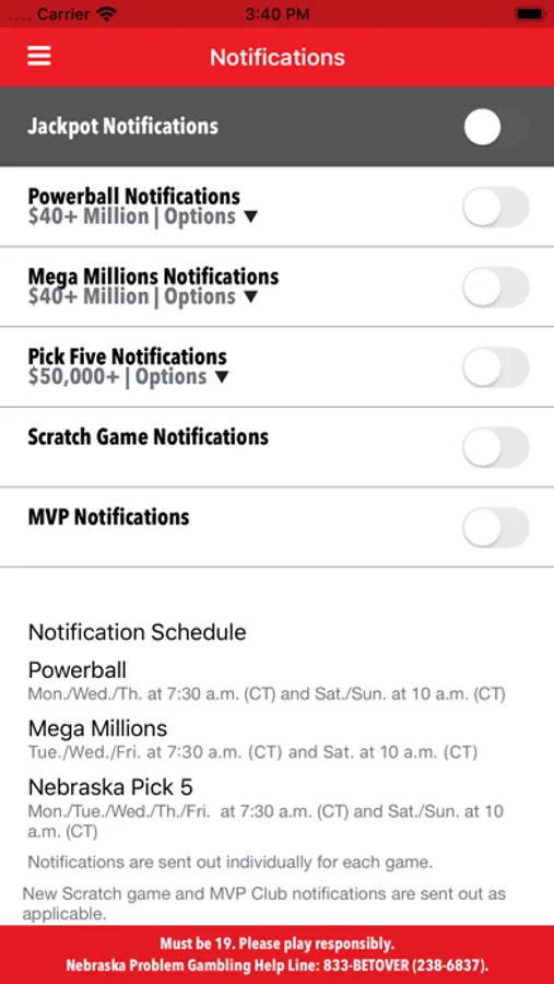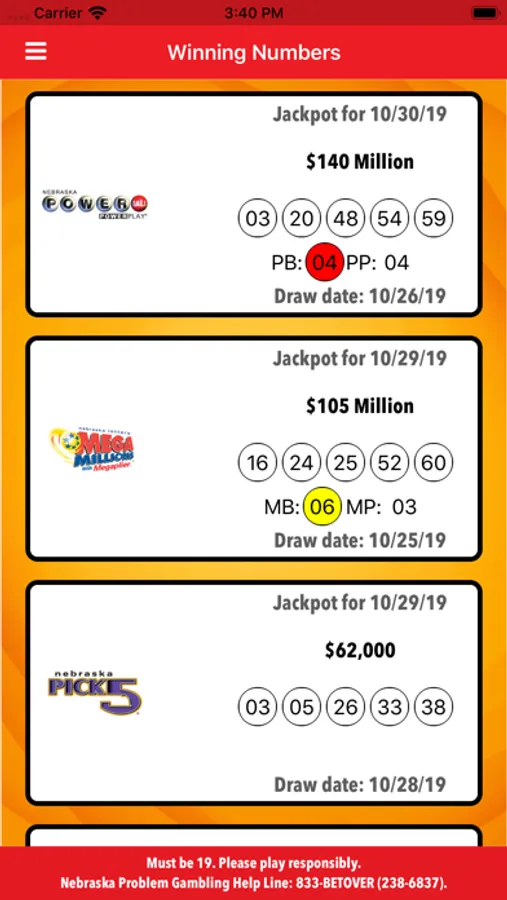 • Ability to set jackpot alerts for Powerball®, Mega Millions® and Nebraska Pick 5®
