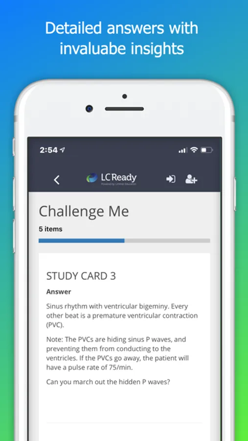 Using Limmer Creative's popular review technology, ECG challenge presents ECG strips in flashcard format with actual clinical presentations. Detailed rationale answers help to improve understanding and interpretation skills. A "hint" feature will help guide users to the correct answer if used. Strips may be viewed randomly or in groups using our "Challenge Me" feature. Once you are confident with an interpretation, the "Mastered it" functionality removes cards from view, allowing you to concentrate on the most relevant strips.