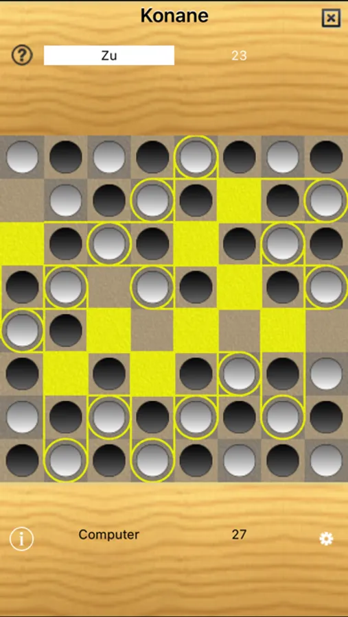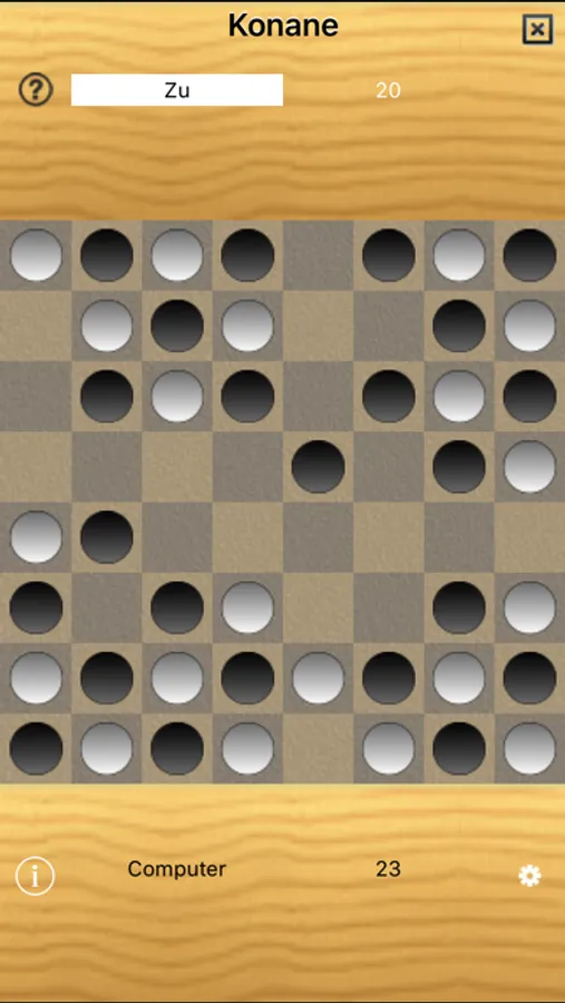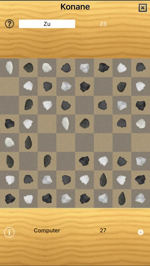 Kōnane is a two-player strategy board game from Hawaii. It was invented by the ancient Hawaiian Polynesians. The game begins with all the counters laid out on the board in an alternating pattern of black and white. Players then hop over one another's pieces capturing them similar to checkers. The first player who can no longer make a capture is the loser, and the other player is the winner. You can tap on the piece to select and then tap on an empty spot to make the move to the spot, if that is a valid move. Alternatively you could use drag to move a piece to an empty spot.