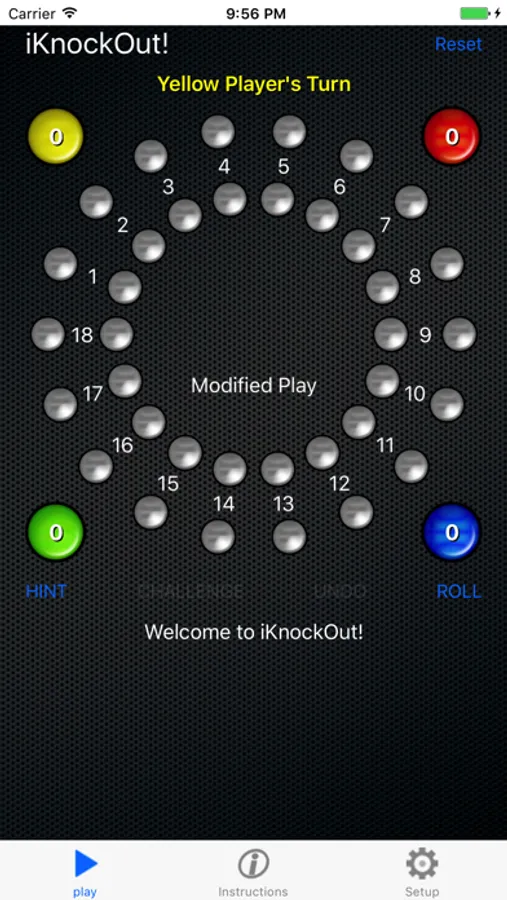 iKnockOut is a fun way for 1 to 4 students to learn addition and subtraction of numbers between 1 and 18. Play against the computer in one player mode. The game consists of a board with 18 numbers 1 through 18 with two spots per number to hold a colored marble. Marbles are placed on a number based on the roll of three dice. Placing a marble on a number with another color marble will knock the other marble out. A number with two marbles of the same color are captured and cannot be played on any more. Capture five numbers before your opponent to win the game. There are three play modes: Standard, Modified and Free Play.