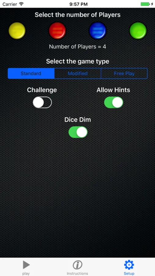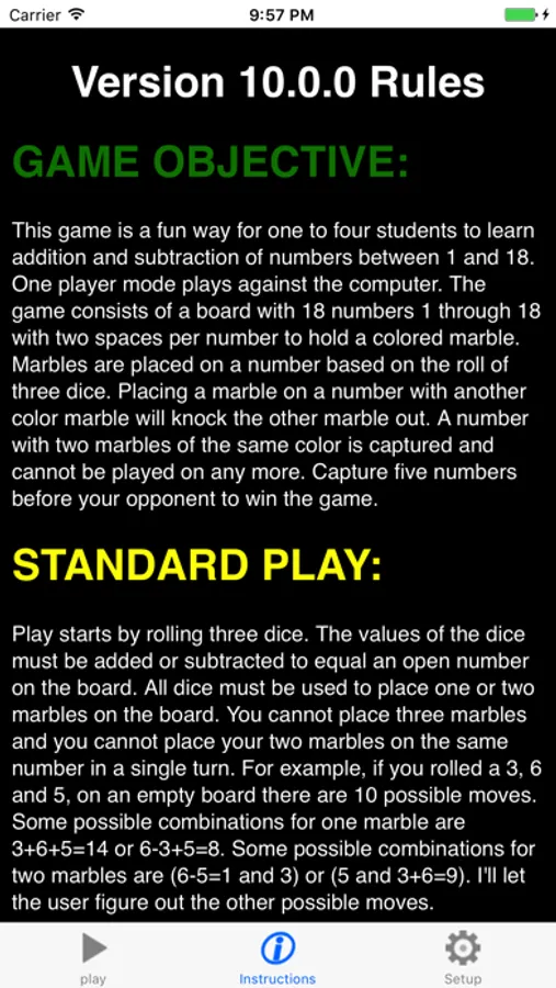 The values of the dice must be added or subtracted to equal an open number on the board. All dice must be used to place one or two marbles on the board. You cannot place three marbles and you cannot place your two marbles on the same number in a single turn. For example, if you rolled a 3, 6 and 5, on an empty board there are 10 possible moves. Some possible combinations for one marble are 3+6+5=14 or 6-3+5=8. Some possible combinations for two marbles are (6-5=1 and 3) or (5 and 3+6=9). I'll let the user figure out the other possible moves or tap HINTS to see other moves.