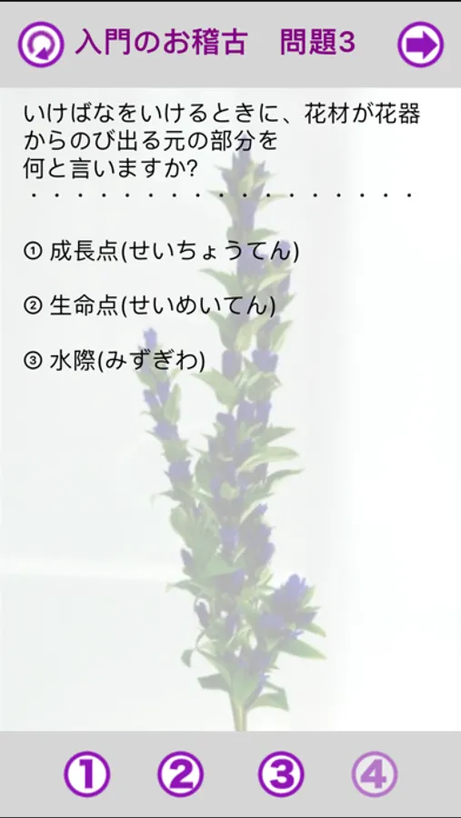 ・いけばなの基礎知識、歴史、お作法、道具の使い方、素材の選び方などをクイズ形式で学ぶことができます。