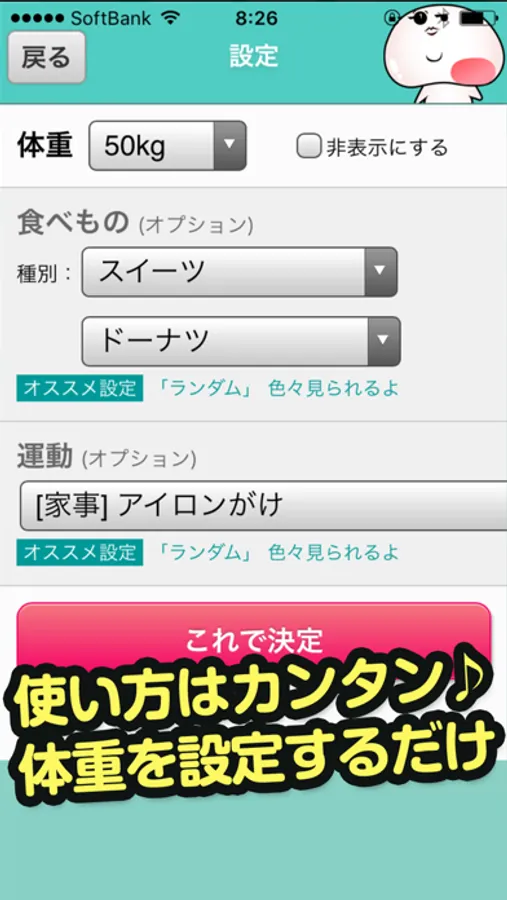 【食べもの】も【運動】も「ランダム」にして、あぶらみくんを触るとランダムでカロリー換算結果を話します。