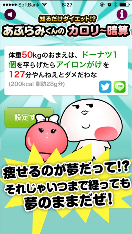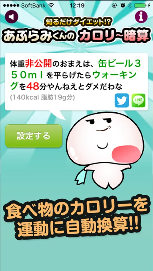 食べ物のカロリーを運動に換算して、あぶらみくんが教えてくれます。