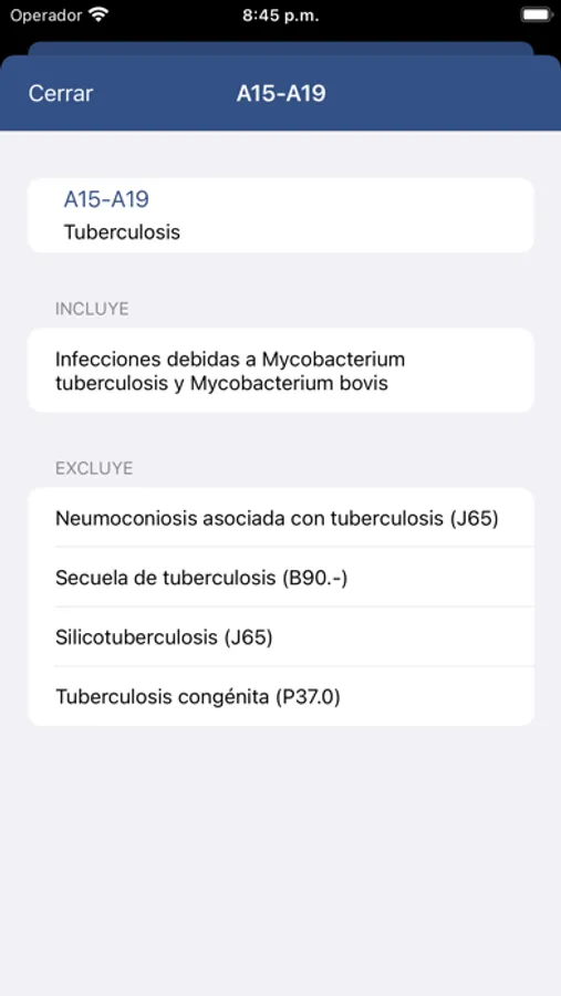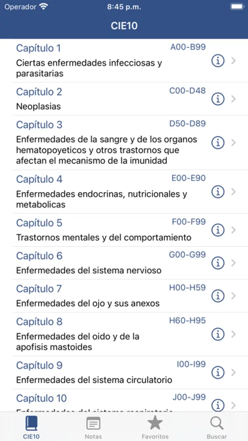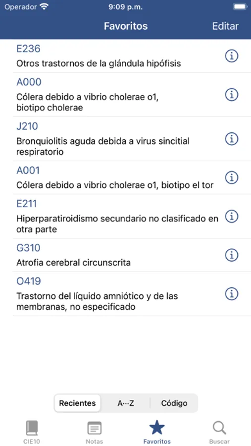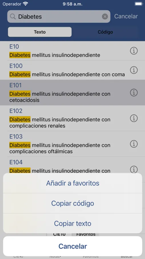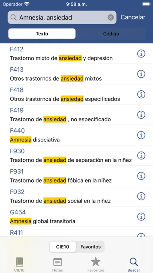 - Búsquedas por la descripción o por el código de la enfermedad; en todo el cie10 o en los favoritos.