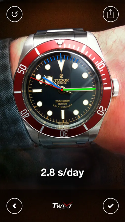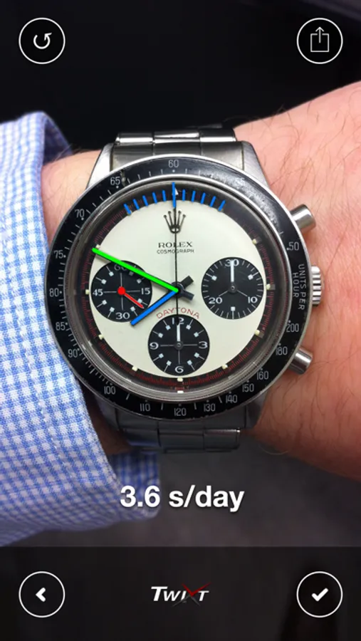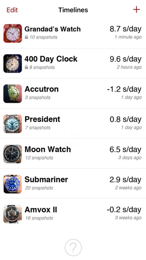 A new snapshot of each timepiece can be added everyday. Using the information from 2 or more snapshots of the same timepiece, Twixt will calculate and show you how precisely the watch or clock is keeping time.