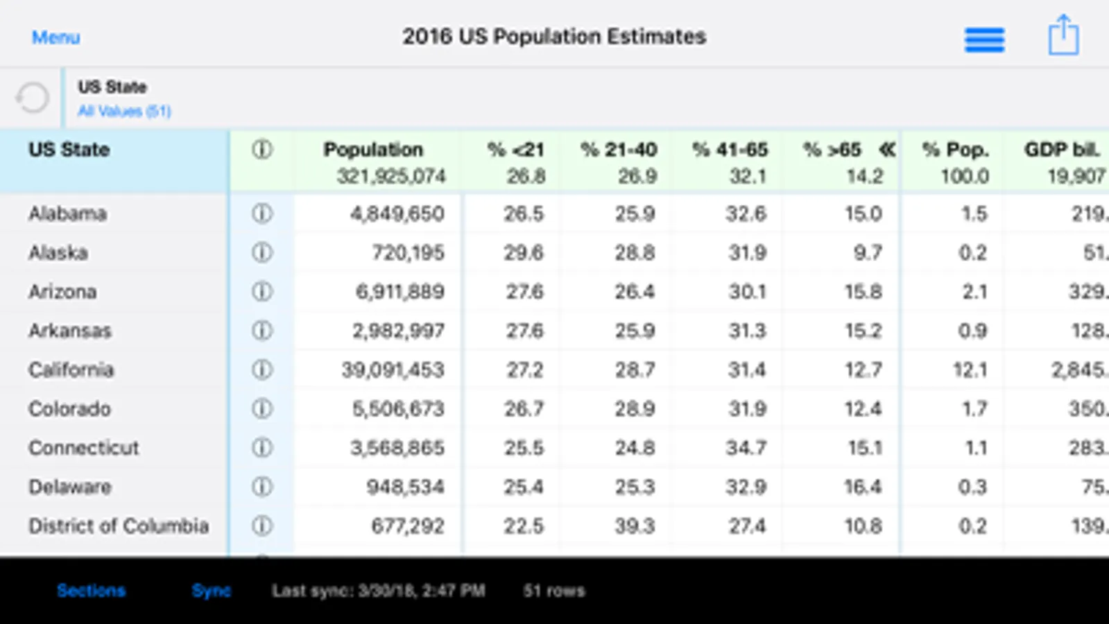DiveTab ships with access to US state data, including statistics for education, healthcare, lotteries, and elections.