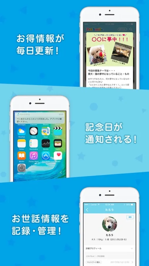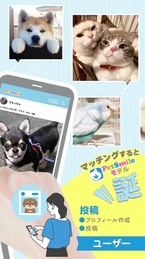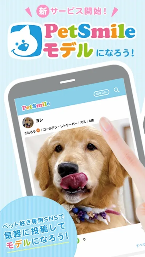 ペットスマイルは、ペットとの楽しい毎日の様子や、記念日の思い出、お世話の内容などをスマホで手軽に記録できるペット専門SNSアプリです。