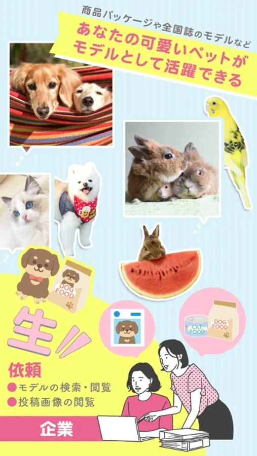 「ペットスマイルモデル」はアプリ上で企業とモデルを結ぶ、マッチングプラットフォームです。