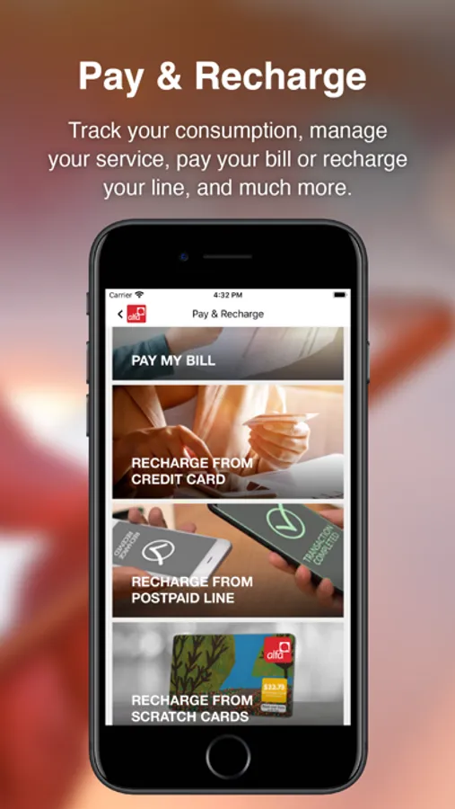Whether you are a Prepaid, Postpaid, Business, Mobile Broadband or Alfanet subscriber, you will be able to track your consumption, manage your service, pay your bill or recharge your line, and much more.
