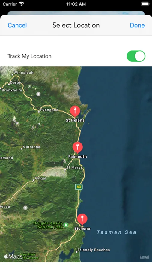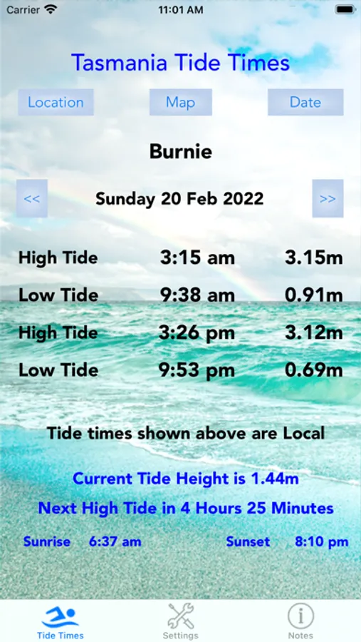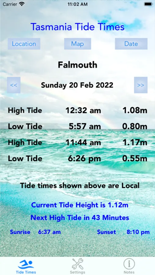 Tasmania Tide Times - Tidal, Sunrise and Sunset Information for 30 locations in Tasmania. Information for your favourite Beach, River or Fishing Spot. Tasmania is a great place to live or holiday. With this application you can track the tidal information for the area as it shows all the low and high tide times for the current day, along with the tide heights. Also shown is the current tide height and the time to the next tide. Sunrise and Sunset Times for that day displayed too. You can also select future dates to make it easier to plan a successful beach day or fishing trip. No internet access is required, so if you have no coverage on your device you can still check the tides, however for the interactive maps a data connection will be needed to initially show them. All major locations in Tasmania are covered including Hobart, Eddyston Point, St Helens, Falmouth, Bicheno, Coles Bay, Pirates Bay, Parsons Bay, Impression Bay, Port Huon, Recheche bay, Maatsuyker Island, Bramble Cove, Burnie, Low Head, Garden Cove, Bass Pyramid, Launceston, Big River Cove, Lady Barron Hr, Swan Island, Macquarie Island, Mersey River Devonport, Spring Bay, Stanley, Stack Island, Three Hummocks, Cape Sorell, Granville Harbour & Pieman River.