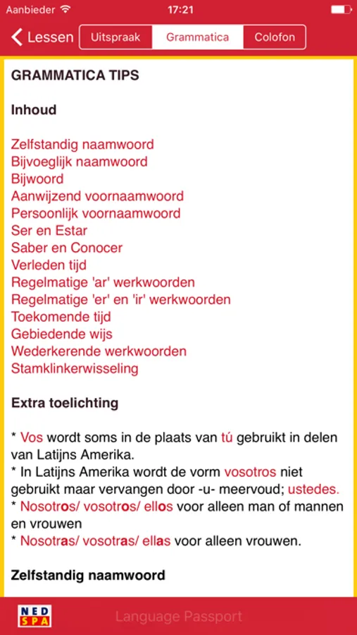 Werkwoorden: De werkwoordstructuur van het Spaans is niet heel eenvoudig. Op de Language Passport vind je een beknopte samenvatting van het Spaanse werkwoordsysteem (regelmatige “ar”, “er” en “ir” werkwoorden) en een aantal belangrijke en veel gebruikte onregelmatige werkwoorden, zoals; ser/estar (zijn), tener (hebben), ir (gaan) , hacer (doen/maken), querer (willen) etc.