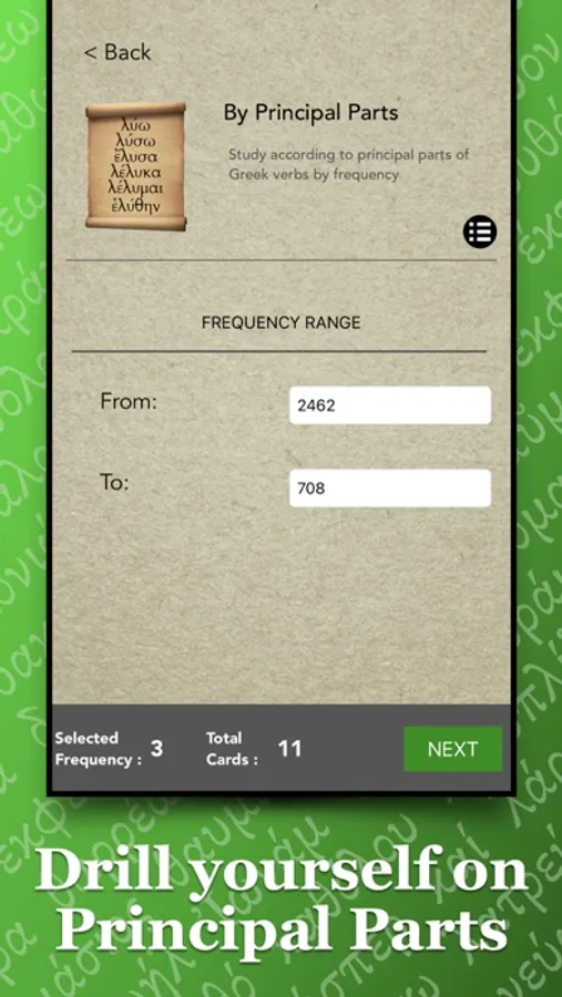 In addition, FlashGreek Pro has a principal parts mode where users can drill themselves on verb principal parts.