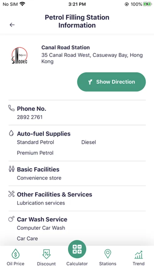 (5)Petrol filling stations search, together with location function, provide consumers locations and details of nearby petrol filling stations; “show direction” helps users plan the route