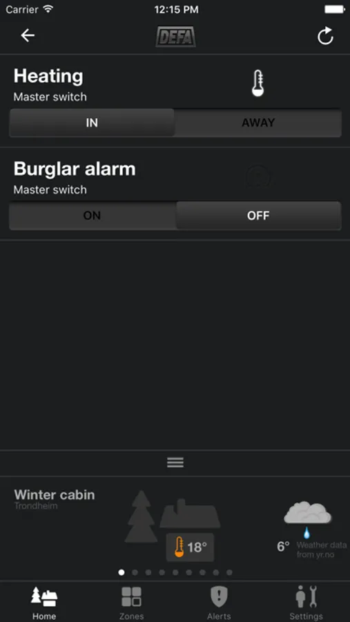 Control heating for up to 6 separate zones. You can set each zone to manual ON/OFF, thermostat or regulator modes independently. Turn burglar alarm ON/OFF. Remote control your Nobø thermostats directly. In addition, the weather forecast is displayed for your location.