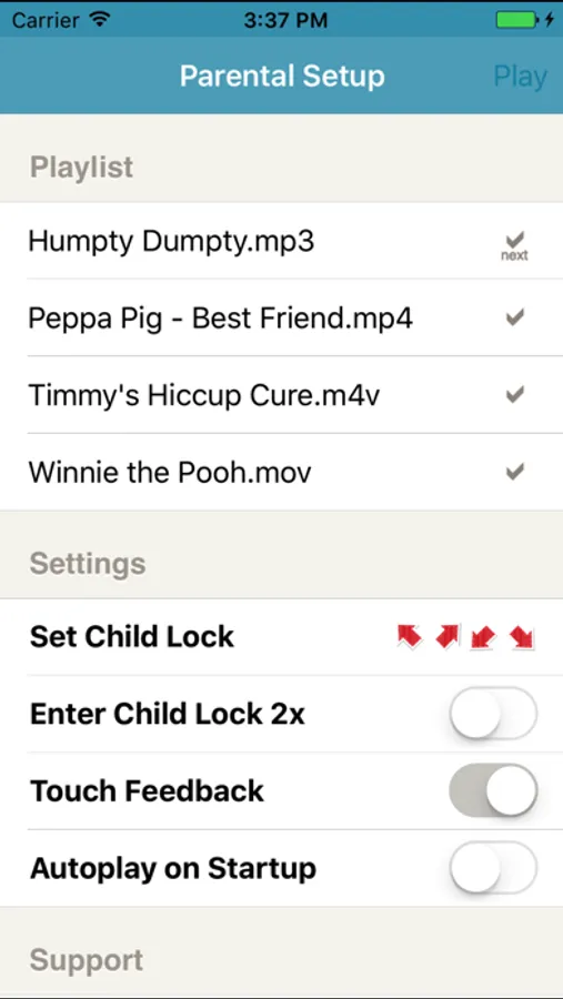 Parents can setup a playlist and configure options, including setting the child lock (a secret combination of tapping the four corners of the screen).