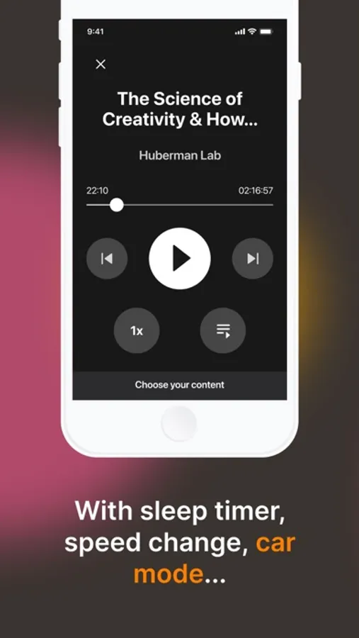 - Full control of the audio: change playback speed, skip or rewind, turn on the sleep timer or car mode...